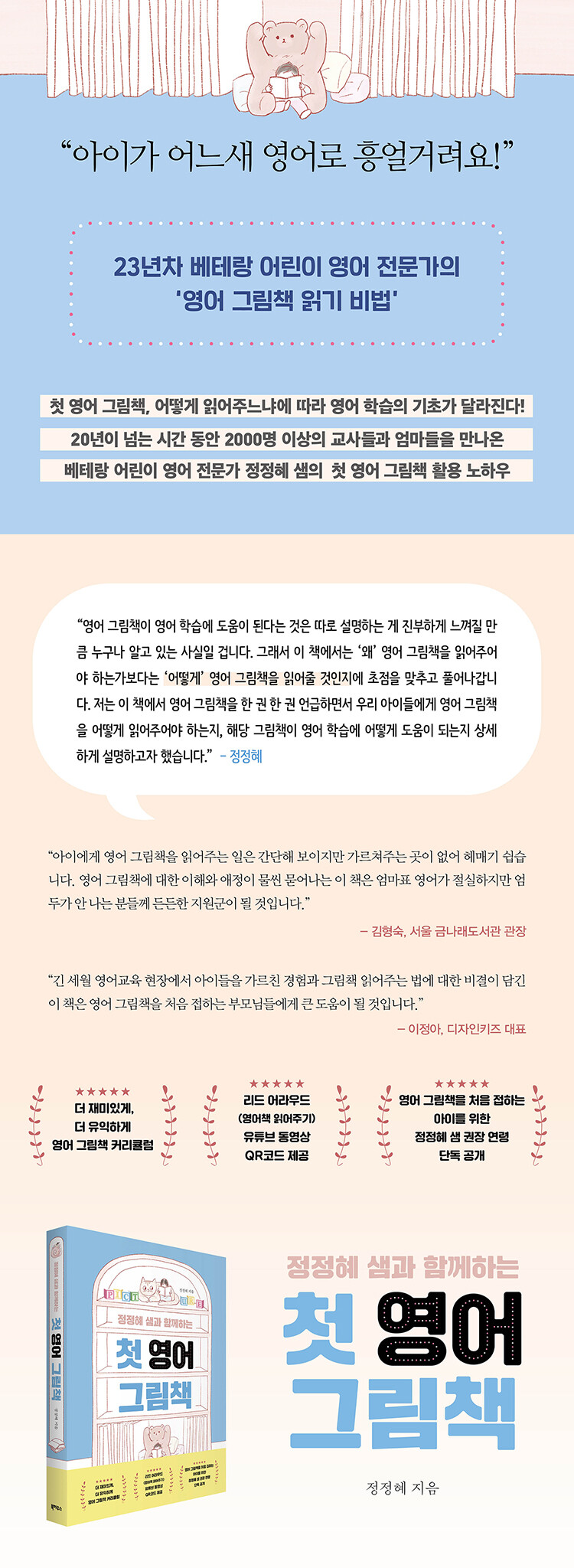 첫 영어 그림책, 어떻게 읽어주느냐에 따라 영어 학습의 기초가 달라진다 어린이 영어 강사들이 몰래 보는 영어 그림책 읽어주기 비법 20년이 넘는 시간 동안 2,000명 이상의 엄마들과 교사들을 만나온 베테랑 어린이 영어 전문가 정정혜. 저자는 지난해 『혼자서 원서 읽기가 되는 영어 그림책 공부법』을 출간하며, 아이에게 영어를 가르쳐주고 싶어하는 부모들과 교사들을 위해 오랫동안 닦아온 노하우를 모조리 담아 선보였다. 특히 리드 어라우드(영어에 익숙해지도록 읽어주기), 함께 읽기(반복해서 읽으며 표현 익히기), 유도적 읽기(자발적 읽기를 위해 유창성 다지기) 등 3단계 영어 그림책 학습법을 대중에게 널리 알리며, 독자들의 폭발적인 관심을 끌면서 그해 베스트셀러 저자로 선정되기도 했다.